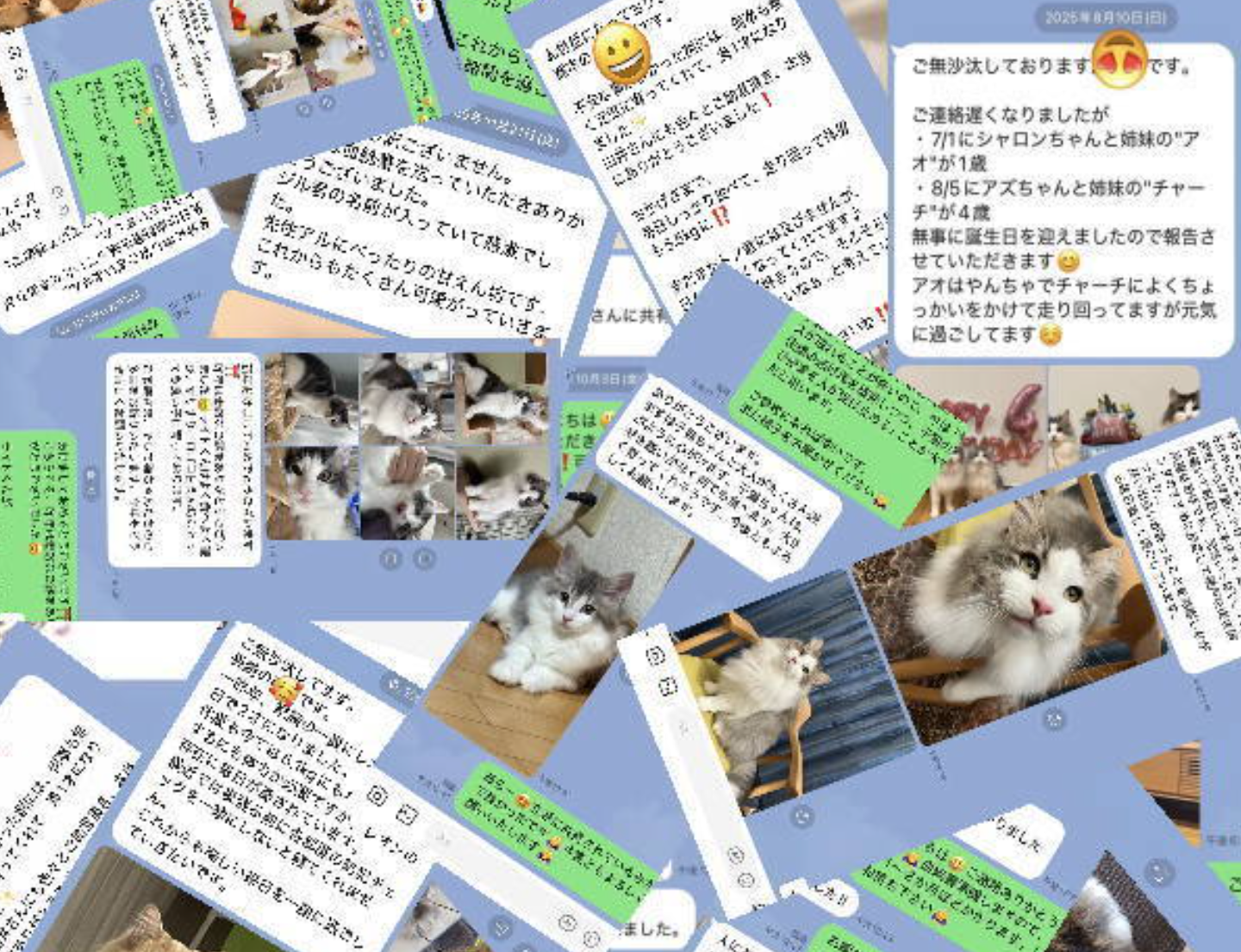 子猫をお迎えいただいて終わりではなく、そこから始まるご家族との暮らしこそが、私たちにとって何より大切な時間です。このページでは、ノルウェージャンフォレストキャットをお迎えくださったご家族からLINEでお送りいただいた、成長の様子や日常のひとコマをご紹介しています。それぞれのご家庭でのびのびと暮らし、少しずつ“家族の一員”になっていく姿からノルという猫の魅力と、その後の幸せを感じていただければ幸いです。