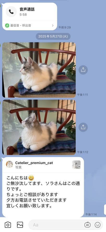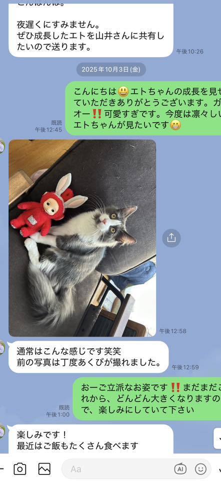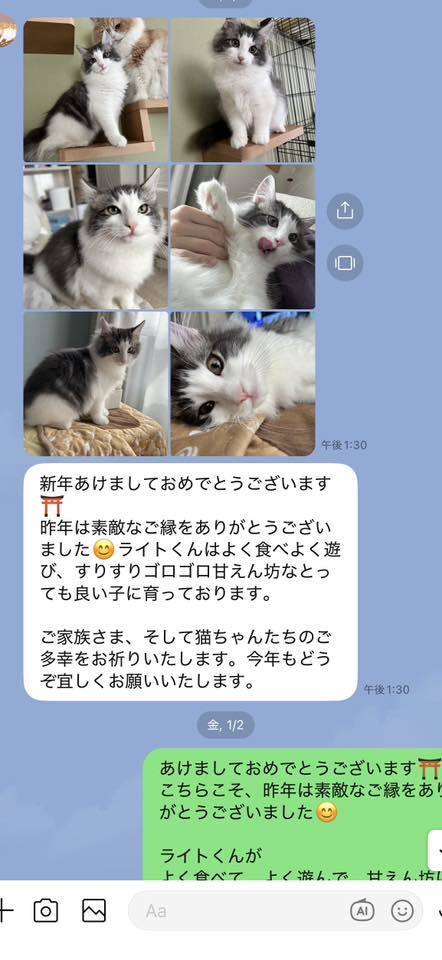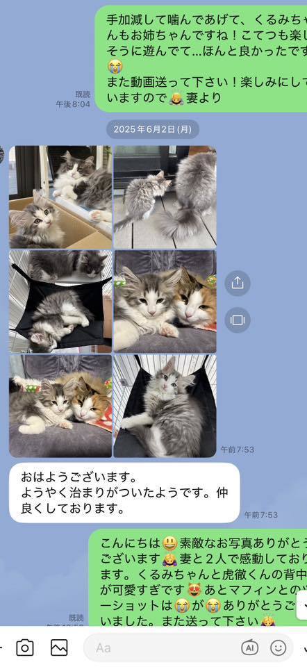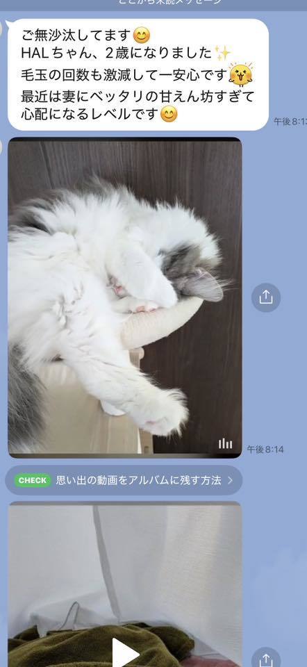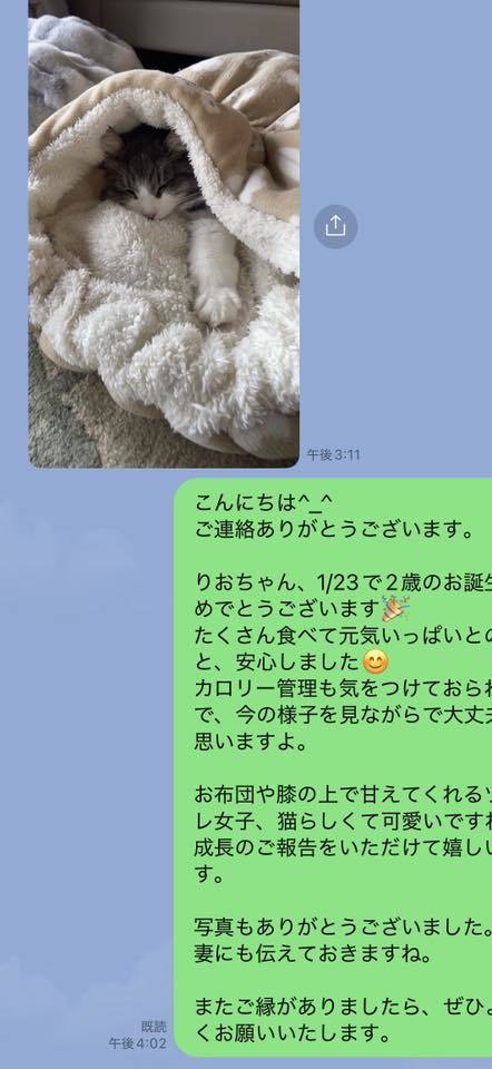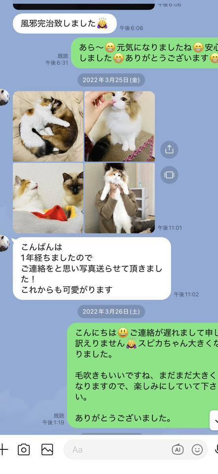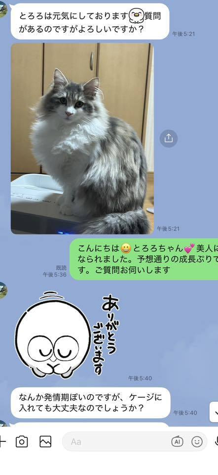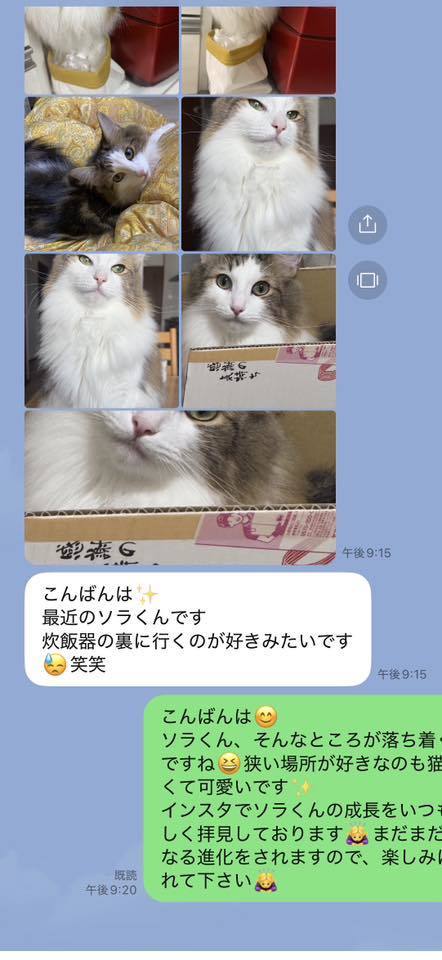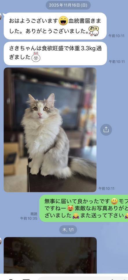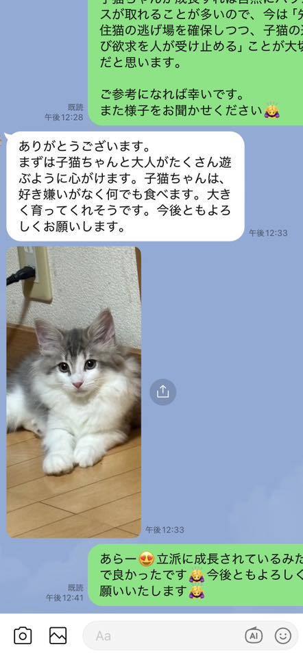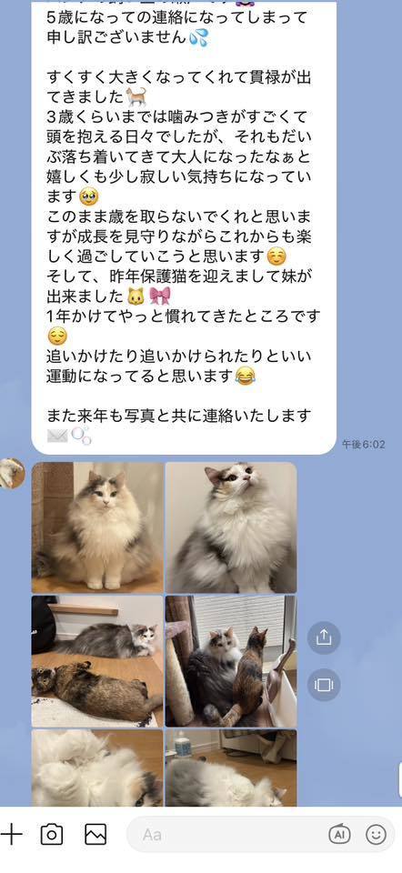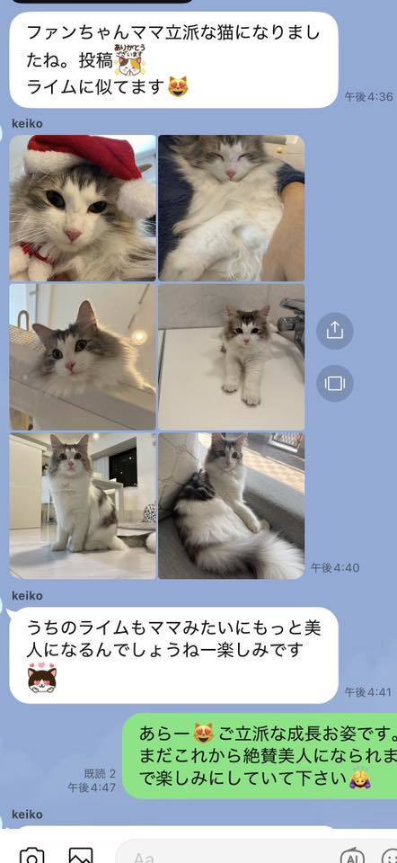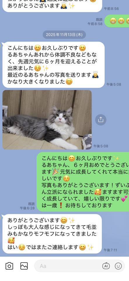 ブリーダーの仕事は、子猫をお渡しした瞬間で終わりではありません。本当の仕事は。その子が幸せな一生を送っているかどうか。こうして成長した姿をみせていただくたびに「間違っていなかった」そう思わせてもらっています。写真を送ってくださる皆さまへ。私たちは、いつも胸がいっぱいです。