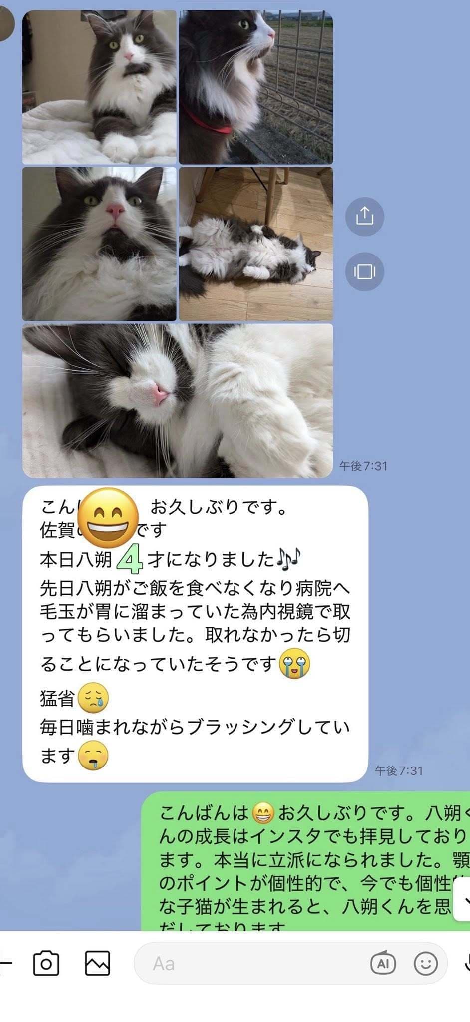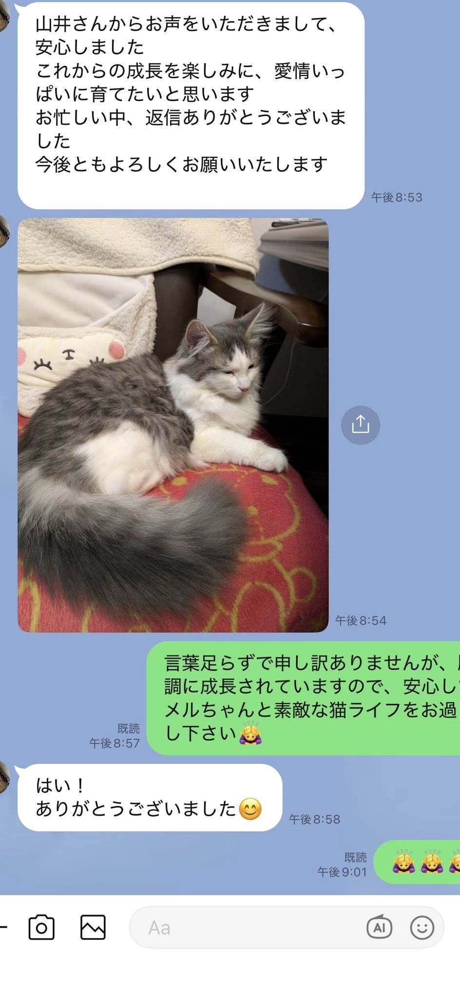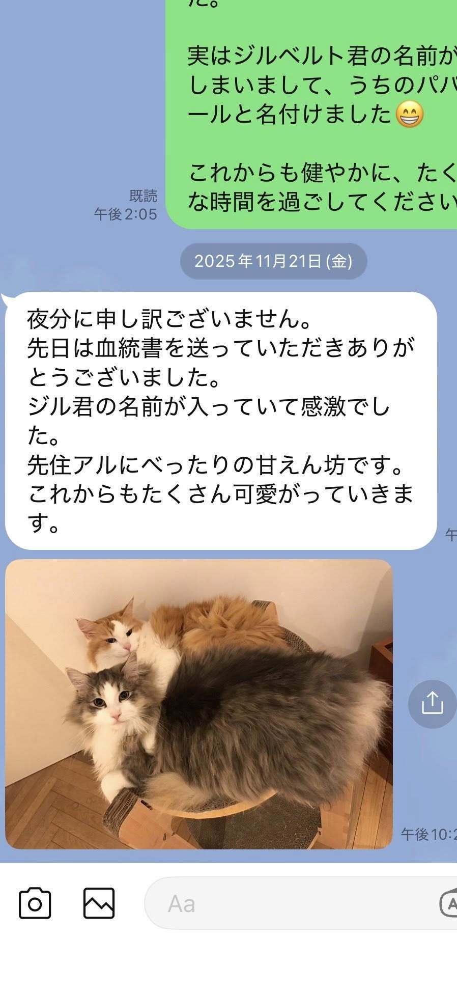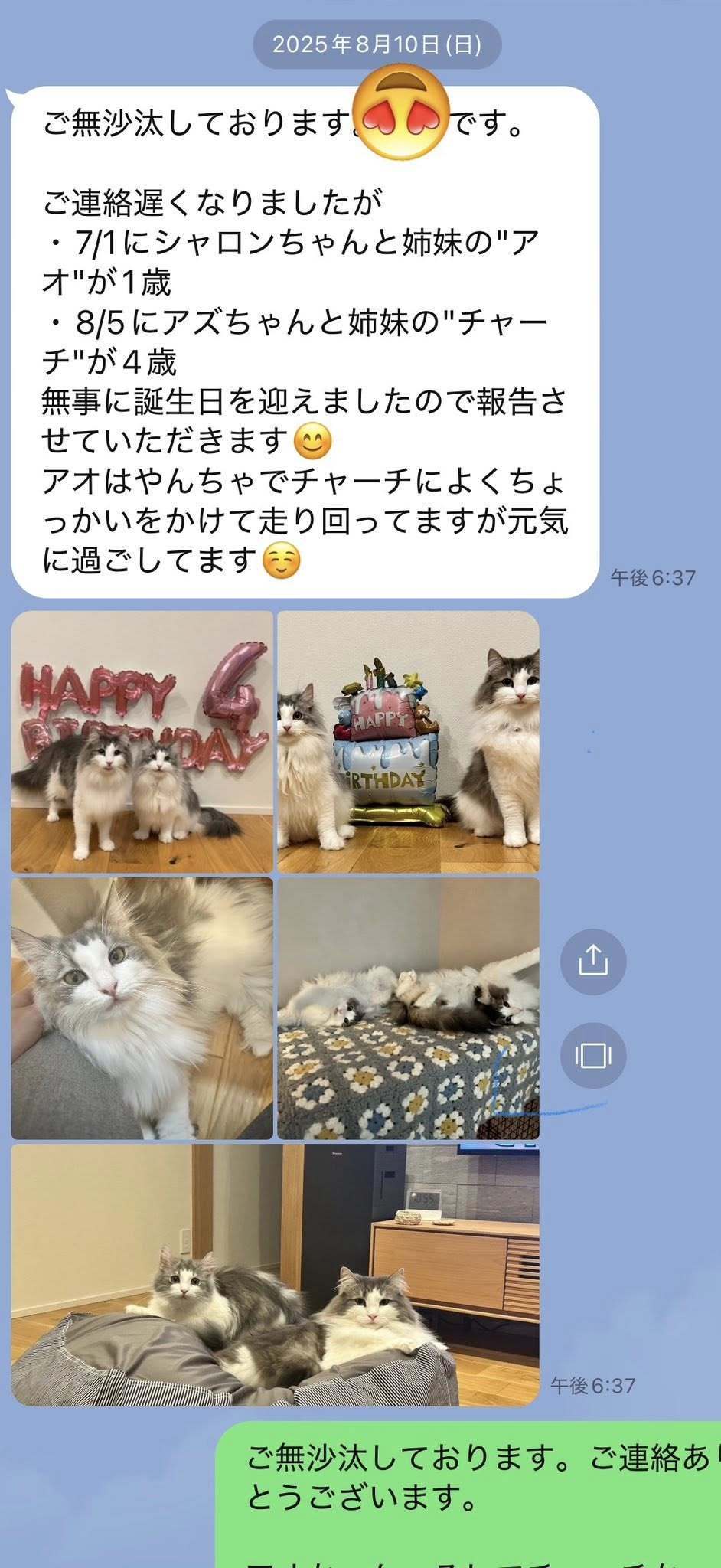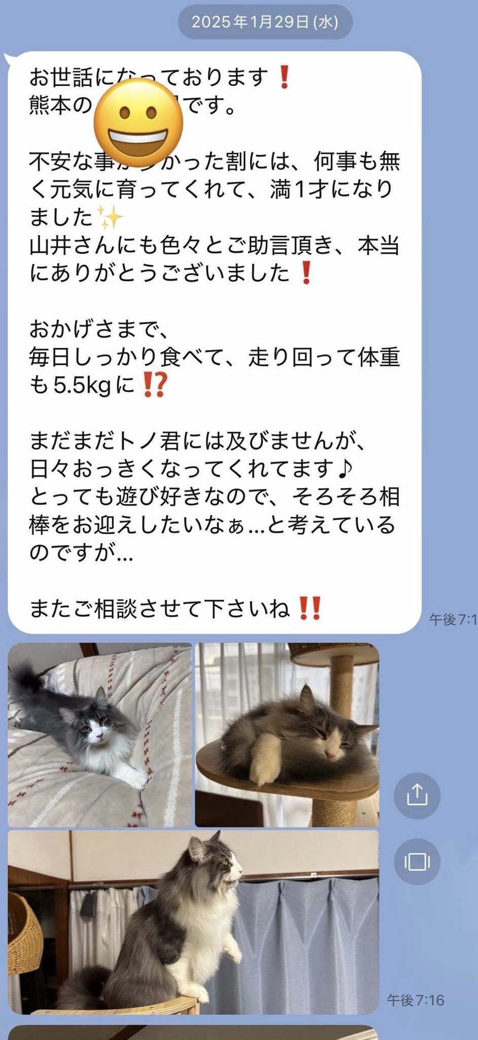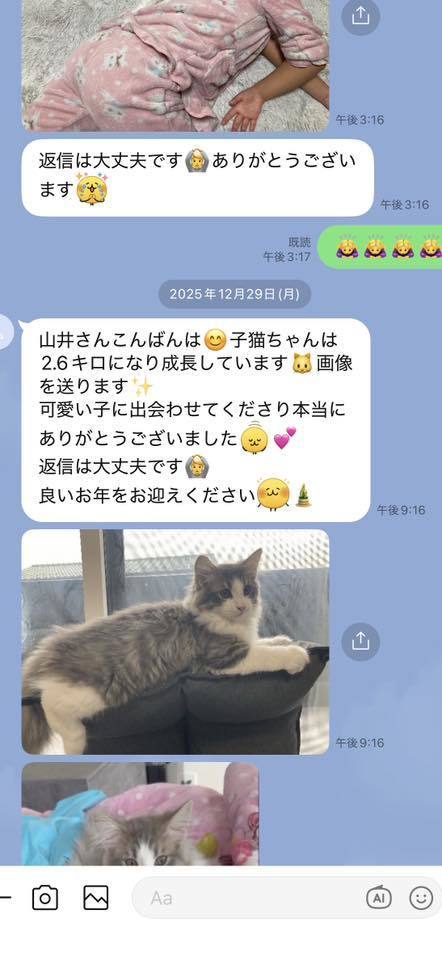 ブリーダーの仕事は、子猫をお渡しした瞬間で終わりではありません。本当の仕事は。その子が幸せな一生を送っているかどうか。こうして成長した姿をみせていただくたびに「間違っていなかった」そう思わせてもらっています。写真を送ってくださる皆さまへ。私たちは、いつも胸がいっぱいです。